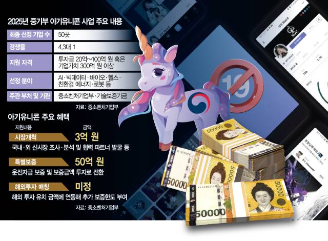 중기부의 아기유니콘은 국내 투자 시장에서 기업가치를 검증 받은 혁신 기업을 발굴해 글로벌 경쟁력을 갖춘 유니콘 기업으로 성장을 촉진하려는 취지에서 시작된 사업이다. 투자 유치 실적 20억 원 이상 100억 원 미만 혹은 기업가치 300억 원 이상인 스타트업에 신청 자격이 주어진다. 올해는 총 217개 기업이 신청해 최종 50개사를 선정, 약 4.3 대 1의 경쟁률을 기록했다. 아기유니콘 기업에는 중기부와 기술보증기금이 보조금 3억 원, 특별보증 50억 원, 글로벌 IR·박람회·컨설팅 등을 제공한다.