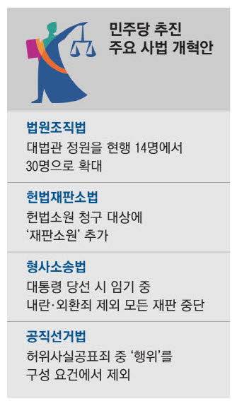 민주당은 현재 대법관 증원법 외에도 대통령 당선 시 임기 중 내란·외환죄를 제외한 모든 재판을 중단하는 '재판정지법', 허위사실공표죄 구성 요건 중 '행위'를 제외하는 '공직선거법 개정안', 법원 판결에 대해 헌법재판소에 헌법소원을 청구할 수 있는 '재판소원' 등을 추진하며 사법개혁에 드라이브를 걸고 있다. 이들 중 민주당이 가장 먼저 꺼내 든 개혁안은 대법관 증원법으로, 현행 14명인 대법관을 30명으로 늘리는 내용을 골자로 한다.