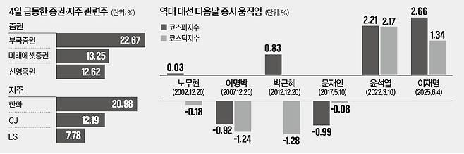 이재명 대통령이 당선된 이후 첫 거래일 증시는 일제히 환호했다. 이재명 정부가 밀어붙이는 자본시장 활성화 정책의 최대 수혜주로 꼽히는 증권과 지주사가 크게 올랐다. 새 정부의 자본시장 공약이 현실화하면 증시가 장기적으로 우상향할 가능성이 높다는 게 증권업계의 대체적인 시각이다.