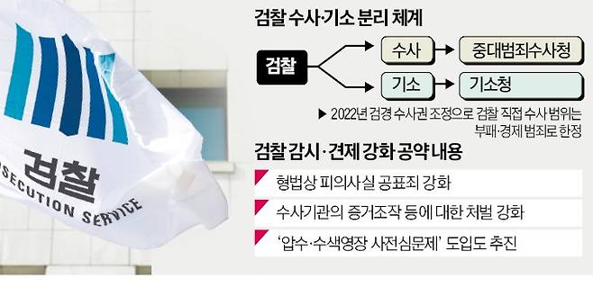 검찰의 직접 수사권은 문재인 정부의 ‘검수완박’(검찰 수사권 완전 박탈) 추진 이후 부패·경제 범죄로 한정돼 있다. 일반 형사 사건 수사권은 경찰에 있다. 법조계에서는 중대범죄수사청을 신설해 검찰이 보유한 마지막 수사권까지 이관하는 방안을 추진할 것으로 보고 있다. 검찰이 수사권을 가진 한 ‘표적 수사’나 ‘정치적 수사’의 유혹에서 벗어나기 어렵다는 판단에서다.