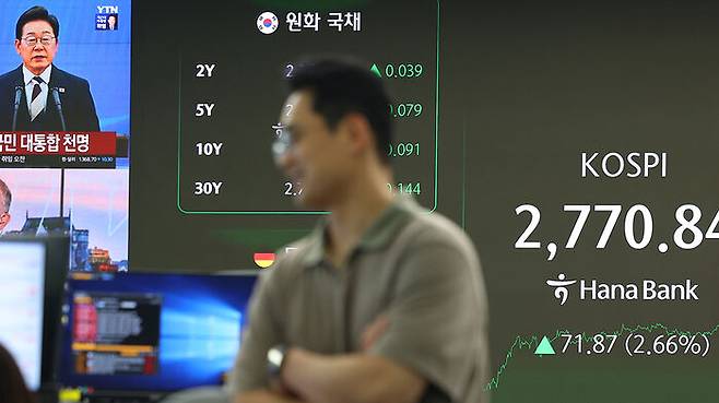 ▲ 코스피가 2% 이상 오르며 2,770선을 넘긴 4일 서울 중구 하나은행 딜링룸 스크린에 코스피 지수와 이재명 대통령 취임 관련 뉴스가 표시돼 있다.