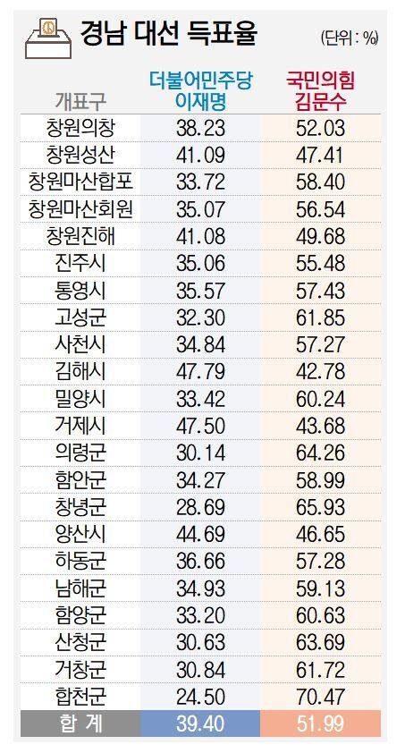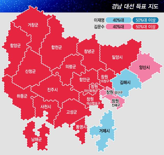 정권교체론 힘 못 쓴 ‘보수 텃밭’ 18개 시군 중 16곳 ‘국힘’ 선택…21대 대선 경남 득표율 분석