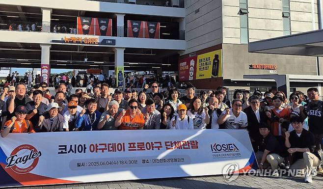 (대전=연합뉴스) 한국스마트혁신기업가협회(KOSIEA) 회원들이 4일 대전 한화생명볼파크에서 열린 프로야구 KT위즈와 한화이글스의 경기를 단체 관람하기 앞서 기념촬영을 하고 있다. 2025.6.4 [한국스마트혁신기업가협회 제공. 재판매 및 DB 금지]