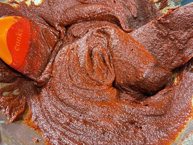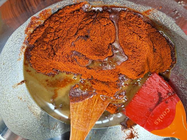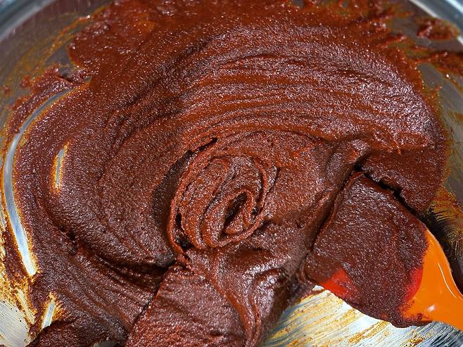 그릇에 따뜻한 물과 조청을 섞고, 넣은 소금이 알갱이가 없어질 때까지 저어준다. 이어 메주가루와 고춧가루를 함께 넣어 완전히 풀어지도록 휘저으면 힘이 들러갈 정도로 뻑뻑해진다.
