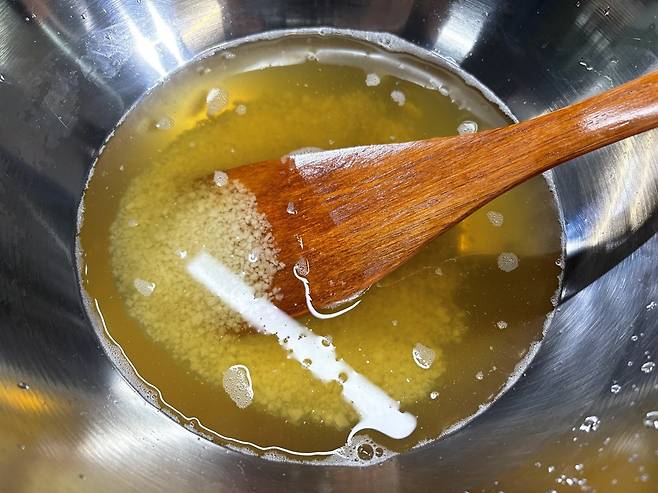 | ▲ 따뜻한 물에 조청과 소금을 넣어 저어준다. |