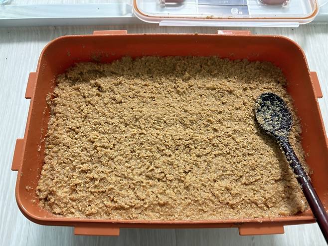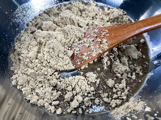 | ▲ 메주가루를 넣은 모습, 메주의 냄새가 그윽하다. |