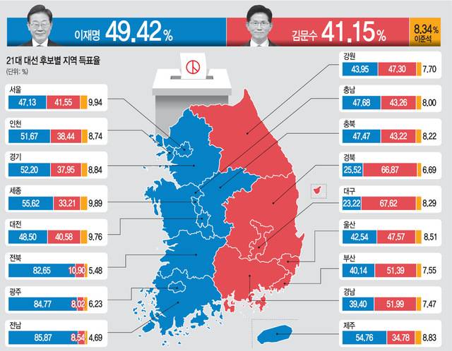 이 대통령은 민주당 텃밭인 호남에서는 80% 넘는 득표율을 보이며 압도적 지지를 받았다. 대선의 ‘캐스팅보터’로 불리는 충청권과 수도권에서도 가장 많은 표를 받았다. 다만 이 대통령의 대전·충남·충북 득표율은 김 후보와 이준석 개혁신당 후보 득표율 합산치보다 낮았다. 3년 전 대선 때보다 호남 득표율도 근소하게 줄었다.