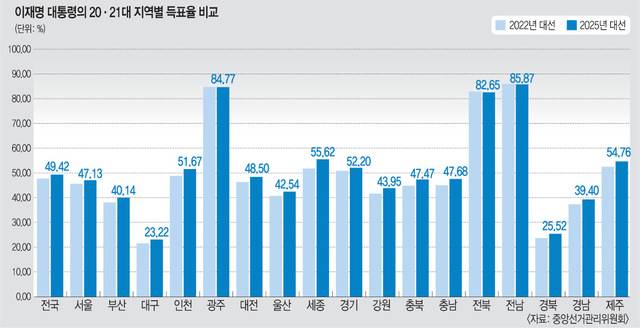 대구·경북(TK)이나 부산·경남(PK) 등 영남권에서는 지난 대선보다 득표율이 근소하게 올랐지만 김 후보에는 미치지 못했다. 이종훈 정치평론가는 “사법 리스크와 가족 관련 논란 등으로 이 대통령에 대한 보수층 내 비토 정서가 영향을 미쳤을 것”이라고 말했다.