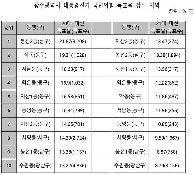 20대 대선에서 국민의힘 득표율 1위를 기록했던 남구 봉선2동은 이번 대선에서 동구 지산2동에 1위 자리를 내준 것으로 확인됐다.