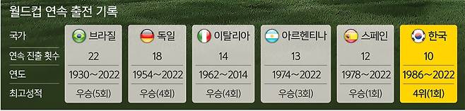 대표팀은 6일 오전 3시15분 이라크 바스라 국제경기장에서 2026 FIFA 북중미 월드컵 아시아 3차 예선 B조 9차전을 치른다. 무패로 B조 1위에 올라 있는 한국은 이 경기에서 무승부만 기록해도 조 2위까지 주어지는 본선 직행 티켓을 확보하게 된다. 이렇게 되면 한국은 1986 멕시코 대회부터 쉬지 않고 11차례 연속으로 월드컵 무대에 나서게 된다. 1954년 스위스 대회를 포함해 월드컵 본선 진출은 12번째가 된다.