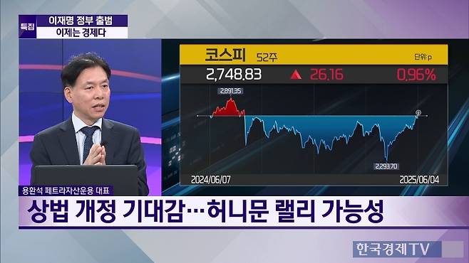 용환석 페트라자산운용 대표는 "새 정부에 따른 허니문 랠리가 지속될 가능성이 높다"고 전망했다. 용 대표는 4일 한국경제TV에서 "경기부양 정책 등에 대한 기대감이 있다"며 이 같이 말했다.