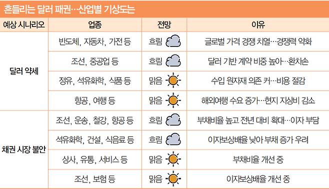 먼저 환율 변동으로 타격이 예상되는 업종은 ‘수출 중심 제조업’이다. 달러로 표시된 제품 가격이 오르면서 글로벌 가격 경쟁력이 약화돼서다. 글로벌 제품 가격 경쟁이 치열한 반도체, 자동차, 가전 같은 산업이 대표적이다.