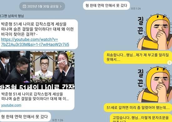 공개된 사진에는 코미디언 남희석이 메신저로 "형한테 연락 안 해서 못 갔다"라며 가짜뉴스 링크를 공유하자, 박준형은 "죄송합니다 행님. 제가 제 부고를 알리지 못해서... 51세로 갈 거면 미리 좀 알렸어야 했는데...고맙습니다 행님...이렇게 문자 조문을 와주시고"라고 유쾌하게 받아쳤다.