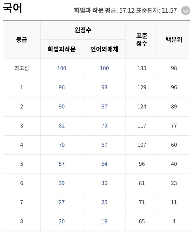 같은 날 오후 8시 기준 EBS i가 발표한 등급컷에 따르면 1등급 기준은 국어 129점, 수학 133점이다.