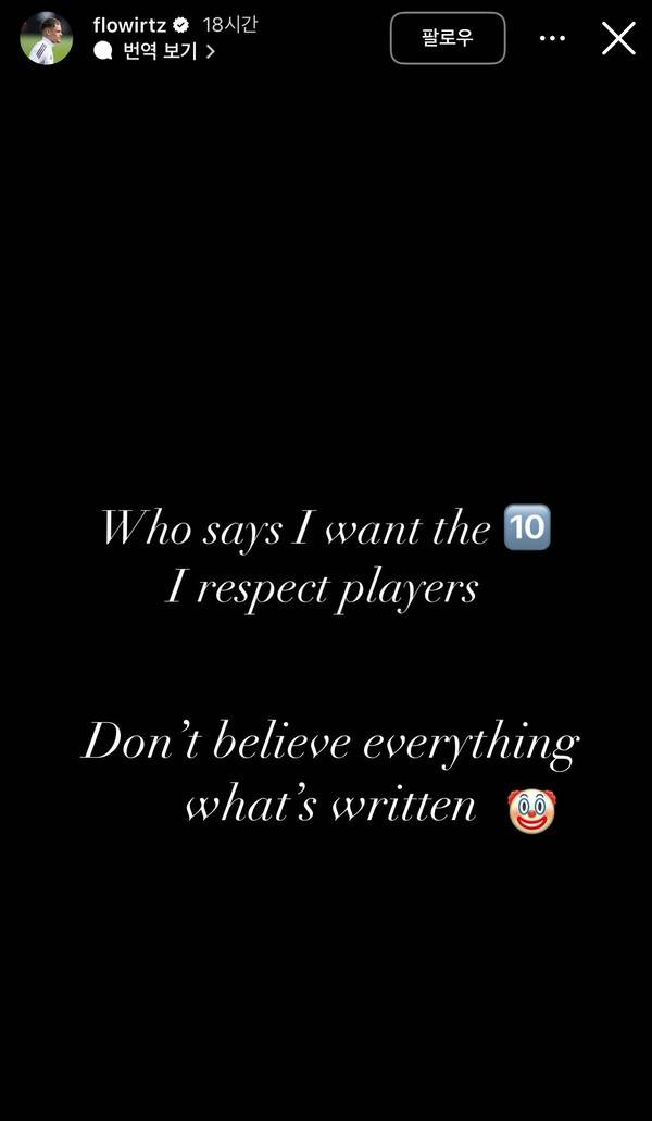 비르츠가 직접 대응에 나섰다. 비르츠는 4일 자신의 SNS에 "내가 배번 10번을 원한다는 말이 어디서 나온 거냐"며 "쓰인 모든 걸 믿지 마라"고 목소리를 높였다. 다른 관점에서 보면 리버풀 이적을 인정한 셈이기도 하다.