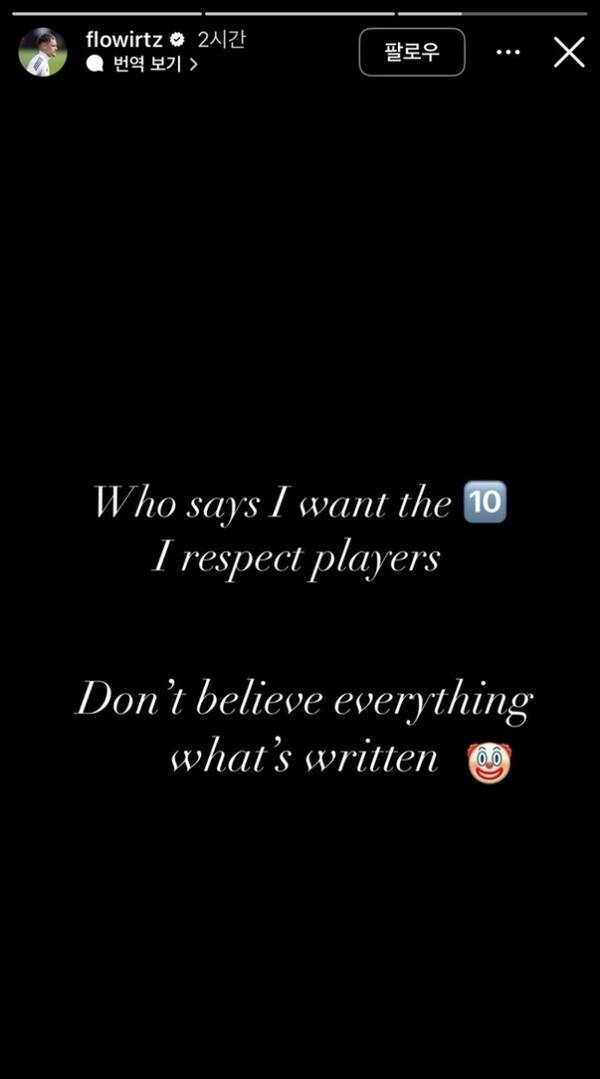 독일의 특급 재능 플로리안 비르츠가 리버풀로 이적 하는 과정에서 등번호 10번을 요구했다는 보도가 나왔지만, 본인이 직접 반박했다.