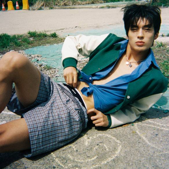 포플린 셔츠는 1백91만원, 체크 패턴의 버뮤다 쇼츠는 1백83만원, 로고 디테일의 브리프는 가격 미정, 모두 Miu Miu. 레더 믹스 모노그램 바시티 재킷은 7백34만원, 참 디테일의 체인 네크리스는 가격 미정, 모두 Louis Vuitton.