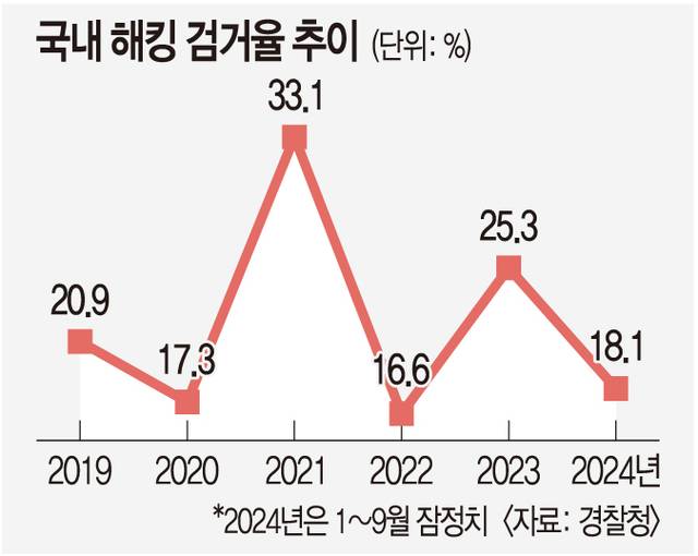 SK텔레콤 해킹 배후도 여전히 미궁이다. 중국 해커 그룹이 배후에 있다는 추측이 나오지만 현재까지 해킹범의 실체는 뚜렷하게 밝혀지지 않았다. 해킹범을 특정한다고 해도 실제 검거까지 이어질 수 있을지에 대해선 회의적인 목소리가 나온다. 해킹 공격 특성상 범죄 검거율이 낮기 때문이다. 경찰청이 지난해 12월 발표한 ‘치안전망 2025’에 따르면 지난해 1~9월 국내 해킹은 2004건 발생했지만 검거는 362건에 그쳤다. 검거율은 18.1%로 전년 동기(22.9%) 대비 감소했다. 보고서는 “해킹 범죄가 계속해서 첨단 지능화되고 있어 검거에 어려움이 있다”고 설명했다.