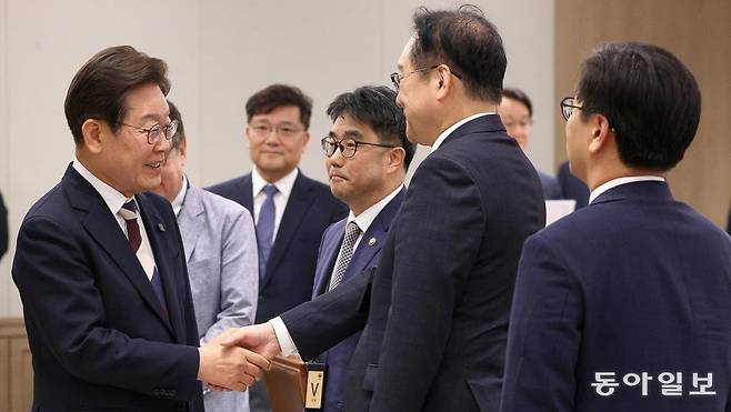| 비상경제점검TF 첫 회의 이재명 대통령(왼쪽)이 4일 서울 용산 대통령실 청사에서 열린 ‘비상경제점검 태스크포스(TF) 회의’에서 정인교 통상교섭본부장과 악수하고 있다. 송은석 기자 silverstone@donga.com |