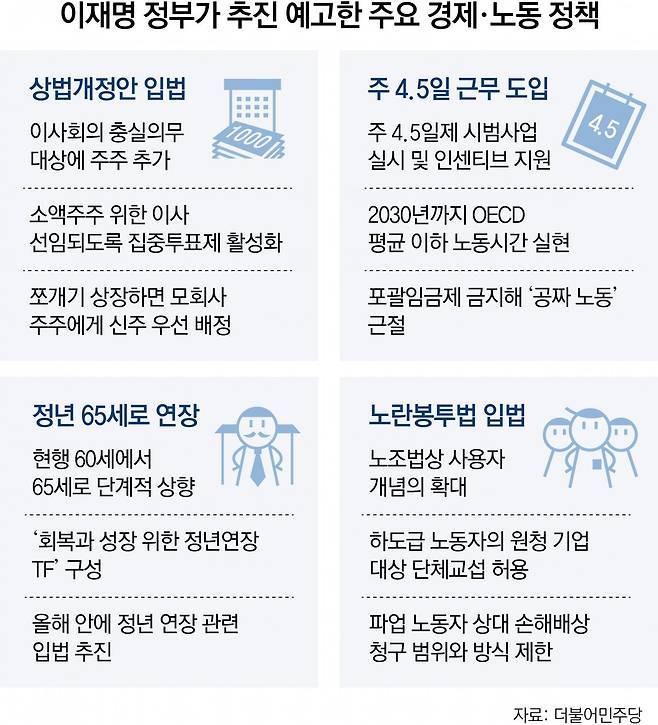 노란봉투법과 상법 개정안은 임기 초에 빠르게 추진할 것으로 보인다. 반면 정년 연장과 주 4.5일제 도입은 시간을 두고 사회적 합의를 한 뒤 추진될 것이란 전망이 우세하다. 이 대통령은 후보 시절 경제5단체장과 만나 정년 연장과 주 4.5일제에 대해 “어느 날 갑자기 계엄 선포하듯 하지 않는다”고 강조했다. 산업계는 새 정부 출범에 따른 경영 변화에 촉각을 곤두세우면서도 ‘실용주의’를 표방하는 이 대통령의 특성상 대화를 통한 절충을 기대하고 있다.