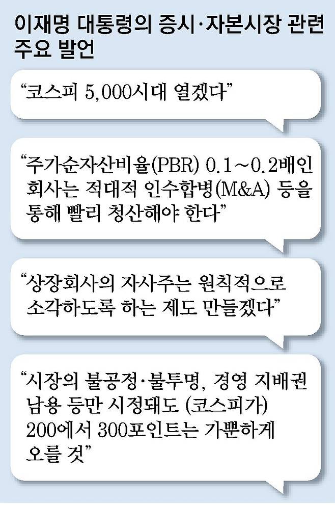 증시 전문가들은 이 대통령의 증시 부양책에 대해 환영하는 분위기다. 정상진 한국투자신탁운용 주식운용본부장은 “새 정부에서 자사주 제도 변화, 상장 주식 축소 등 시장 제도가 바뀔 것으로 기대한다”고 말했다. 안형진 빌리언폴드자산운용 대표도 “올해가 거버넌스 이슈 해결의 원년이 됐으면 좋겠다”고 했다.