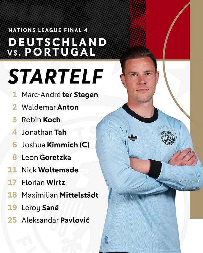 이날 독일은 닉 볼테마데를 비롯해 플로리안 비르츠, 르로이 사네, 막시밀리안 미텔슈테트, 알렉산다르 파블로비치, 레온 고레츠카, 조슈아 키미히, 로빈 코흐, 조나단 타, 발데마르 안톤, 골키퍼 테르 슈테켄이 선발 출전한다.