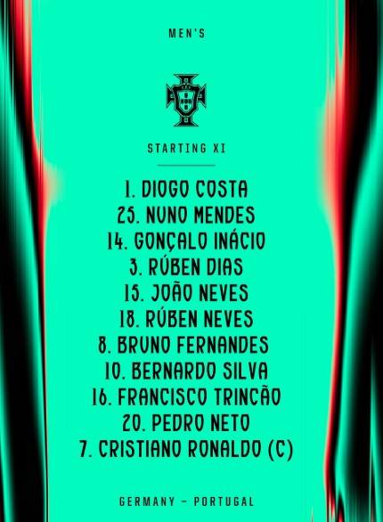이에 맞서는 초대 우승국 포르투갈은 크리스티아누 호날두를 필두로 페드로 네투, 프란시스코 트린캉, 브루노 페르난데스, 후벵 네베스, 베르나르두 실바, 누누 멘데스, 곤살루 이나시우, 후벵 디아스, 주앙 네베스, 골키퍼 디오고 코스타가 선발 명단에 이름을 올렸다.