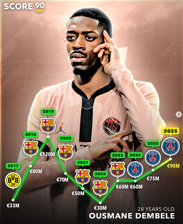 뎀벨레의 이적 시장 가치도 폭등했다. 2022년 바르셀로나에서 부진하며 3000만 유로까지 떨어졌지만, 이후 PSG로 이적해 맹활약하면서 3년 만에 3배나 폭등했다. 유럽 축구 사이트 ‘스코어 360’은 뎀벨레의 이적 시장 가치 변화를 그래픽으로 전달하면서 현재는 9000만 유로(약 1,405억 원)까지 올라갔다고 전했다.