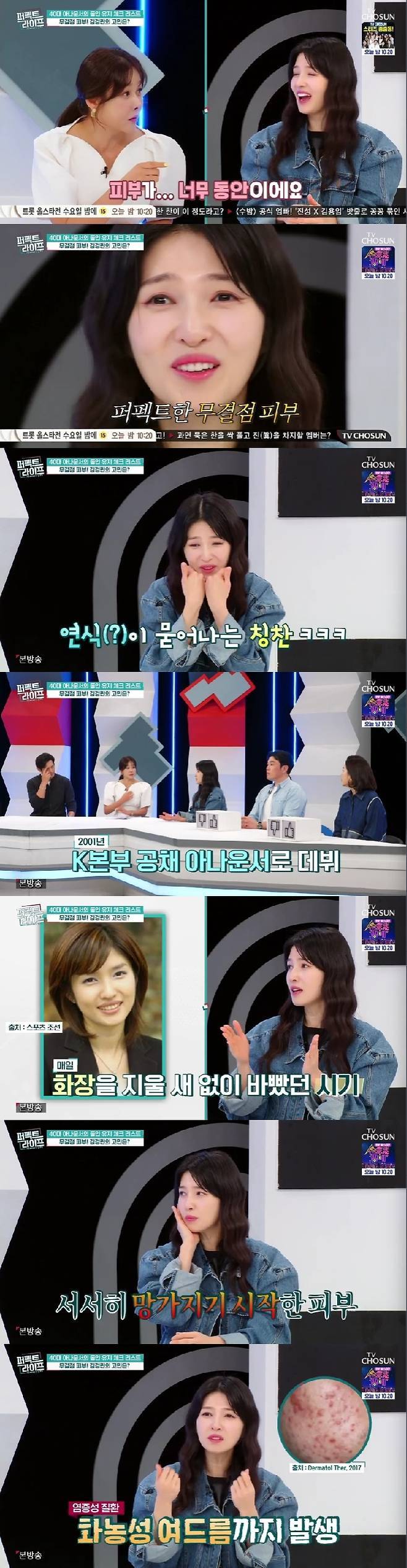 김경란은 "이런 얘기 들으면 약간 인생 드라마 같다. 사실 피부가 인생 최대의 고민이었다"라고 해서 주위를 놀라게 했다.