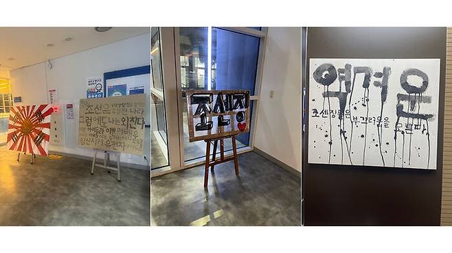 대학가에 따르면 서울 성북구 한성대 건물 내에 3일 오후 11시 10분쯤 일본 제국주의를 상징하는 욱일기와 태극기를 섞어놓은 듯한 그림과 '조센징', '역겨운 조센징들은 부끄러움을 모른다' 등 혐오 발언이 적힌 전시물 여러 점이 설치됐습니다.