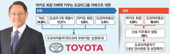 그룹의 모태기업이자 상호출자 관계인 도요타자동직기를 아예 인수해 비상장기업으로 전환하는 내용으로, 이 과정에서 도요다 아키오 그룹 회장의 지배력을 키우고 과감한 미래 투자 의사결정에 나선다는 포석이다.