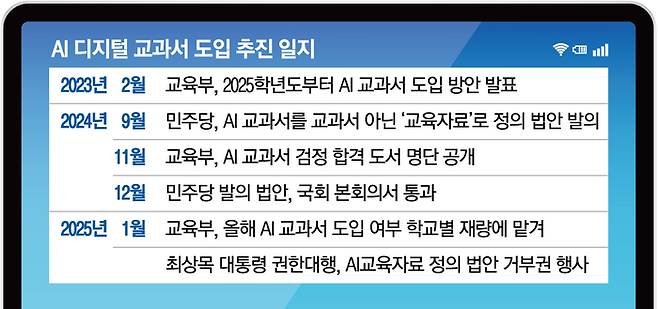 4일 교육계에 따르면 윤석열 정부는 올해 3월부터 전국 초등학교 3·4학년과 중학교 1학년, 고등학교 1학년 영어·수학·정보 과목에 AI 교과서를 도입했다. 당초 윤석열 정부는 AI 교과서를 전국 모든 학교의 해당 학년에 ‘전면 도입’한다는 계획이었지만, 교원·학부모들의 우려와 더불어민주당의 강한 반발에 올해는 ‘학교 자율’에 따라 시범 도입하고 차차 도입 범위를 확대한다는 계획이었다.