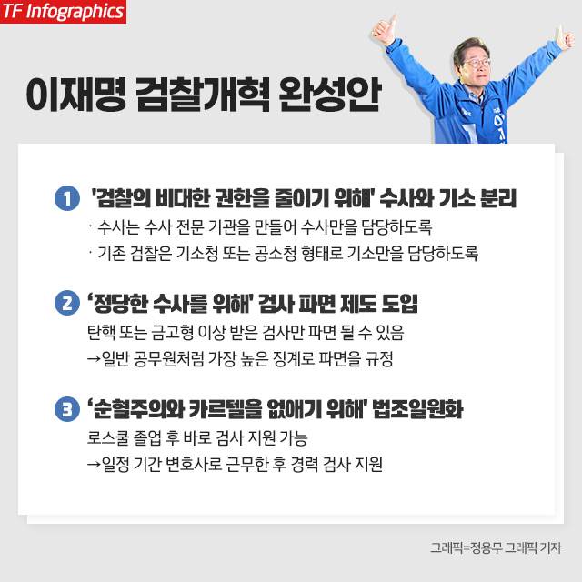 이 대통령은 후보 시절 정책 공약집에서 검찰·사법개혁 완수를 선명히 내걸었다. 검찰개혁 공약을 보면 △수사권-기소권 분리 △기소권 남용 사법통제 강화 △압수·수색영장 사전심문제 △수사기관의 증거조작 등 처벌 강화 △검사 파면제 △경력검사 임용을 통한 법조 일원화 등이다.