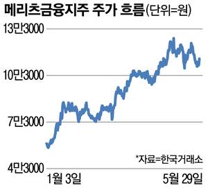 4일 한국거래소에 따르면 지난달 29일 기준 메리츠금융지주 주가는 11만4000원으로 지난해 초(5만8800원) 대비 93.9% 상승했다.