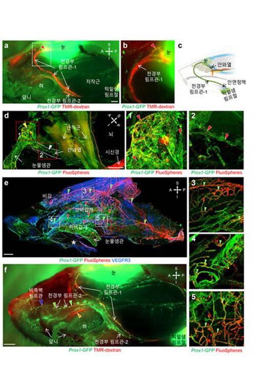 관찰 결과, 뇌척수액이 눈 주위, 코안 쪽 그리고 입천장 림프관을 통해 눈·코 옆 림프관으로 모인 뒤 턱밑샘 림프절로 배출되는 것으로 나타났습니다.