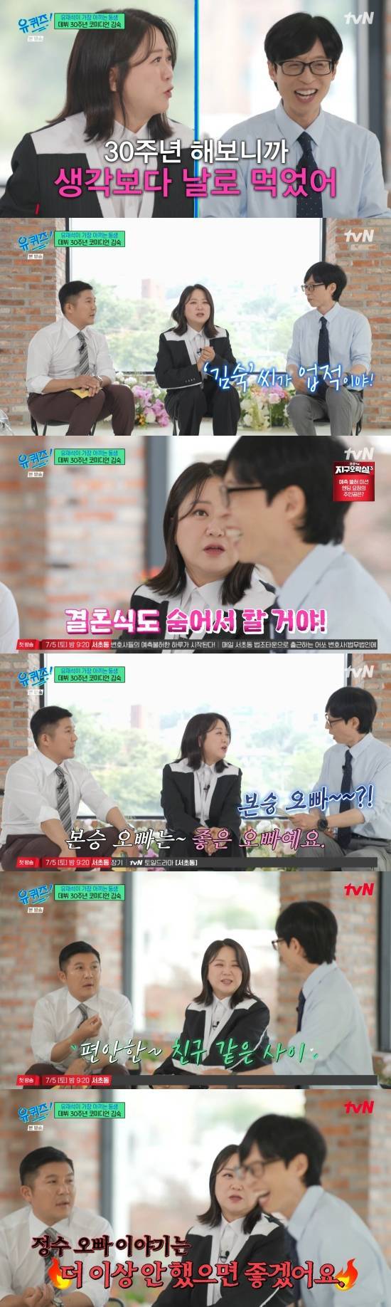 4일 방송된 tvN 유 퀴즈 온 더 블럭'(유퀴즈)에서는 1995년 21세에 '대학개그제' 은상으로 데뷔해 30주년을 맞은 김숙이 게스트로 출연한 장면이 전파를 탔다.