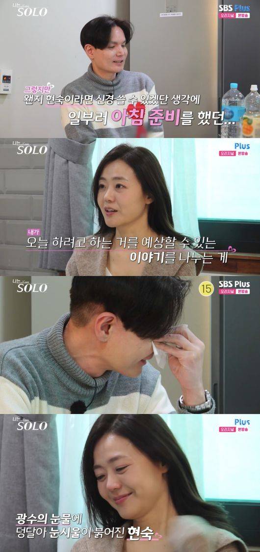 그러자 광수는 “감동인데?”라며 갑자기 눈물을 흘렸고, 당황하던 현숙도 덩달아 눈시울을 붉혔다. 현숙은 “사실 미안한 마음이다”라고 했고, 광수는 ‘오늘 아침에 그냥 나 생각해서 와준 거 아니냐. 내가 아는 현숙은 그거는 최선을 다하는 거다. 그 마음이 고마워서 감동”이라고 전했다.