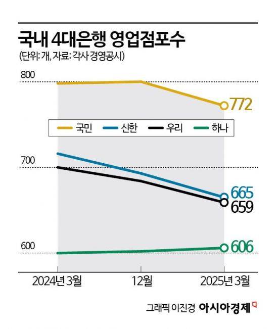 문을 닫는 영업점이 늘면서 4대 은행의 국내 점포수도 빠르게 줄고 있다. 올 1분기 기준 2702개로, 지난해 4분기(2779개) 대비 77곳 감소했다. 1년 전과 비교하면 112곳이 줄어든 것으로 집계됐다. NH농협은행을 포함해 5대 은행으로 확대하면 3776개로, 1년 사이 150개 영업점이 사라진 것으로 나타났다. 비대면 거래 활성화로 은행 점포를 찾지 않은 고객이 늘면서 소위 '노는 점포'가 생기자 은행들이 정리에 나선 것이다.