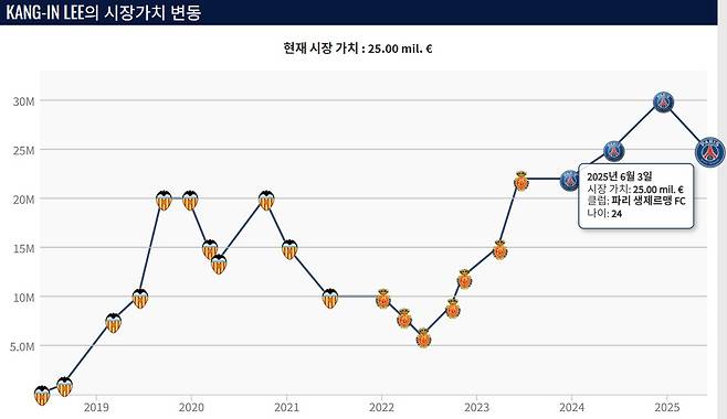 이강인은 최근까지 추정 몸값이 3000만 유로(약 467억원)였다. 이번 수정을 통해 2500만 유로(약 289억원)로 약 17% 하락했다.