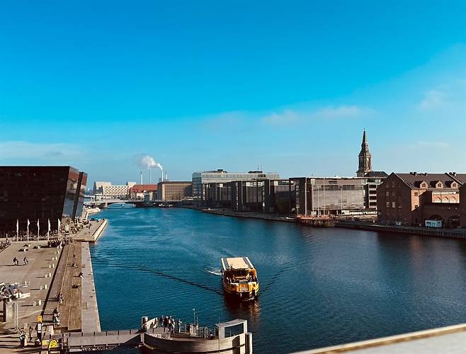 | ▲ 코펜하겐 운하와 도시의 전경 코펜하겐을 가로지르는 운하와 왼쪽에 검은 형상이 블랙다이아몬드다. 하늘은 파랗고 공기는 맑다. 구름은 조각 조각 하늘에 떠있고 투명한 해파리는 운하속 어딘가에서 헤엄을 치고 있다. 나는 이 모든 것을 조용히 바라본다. |