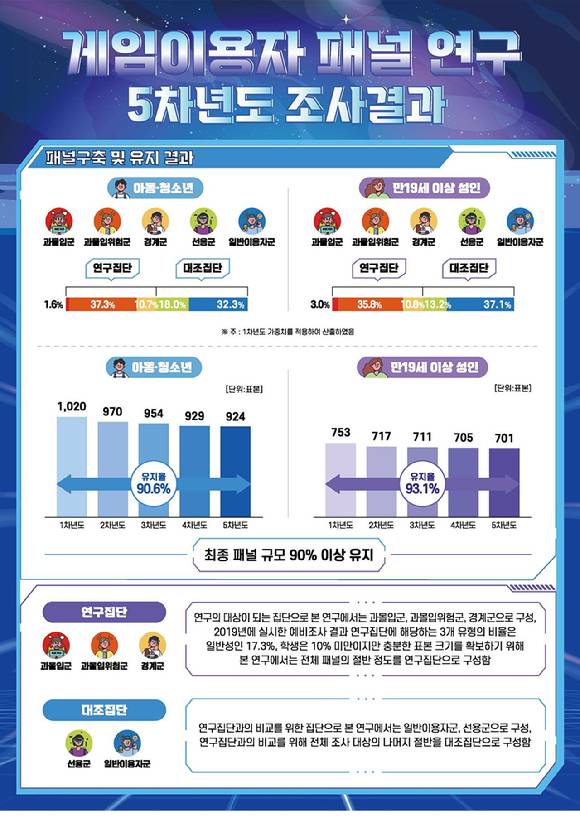 이 연구는 △5년간의 게임행동변화를 종합적으로 관찰 △과몰입군이 지속되는 응답자의 비율을 지속 추적 △게임행동변화의 특성 분석을 위해 게임이용시간, 게임리터러시, 사회적 관계, 심리적 요인, 학습 요인 및 경제적 요인 변화 추이 검토 △게임이용자가 게임을 더 이상 지속하지 않거나 일시적으로 중단하는 사례 검토 △의미 있는 유형변화를 나타낸 아동·청소년 응답자 중 일부 선별해 심층인터뷰 등의 절차로 진행됐다.