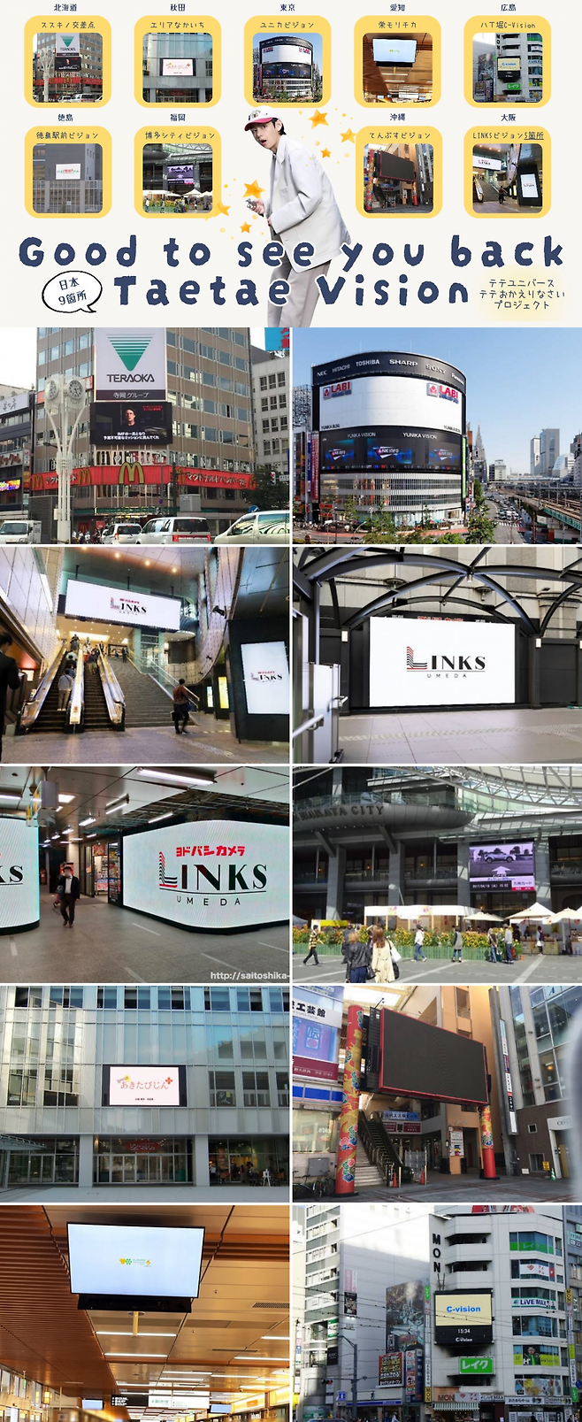 뷔의 일본 팬클럽 '태태 유니버스'(BTSV_JPN)는 1년 6개월간의 군 복무를 마치고 전역을 앞둔 뷔에게 감사의 마음을 전하기 위해, 서울과 일본 9개 도시에서 대형 전광판 영상 서포트를 진행한다고 밝혔다.