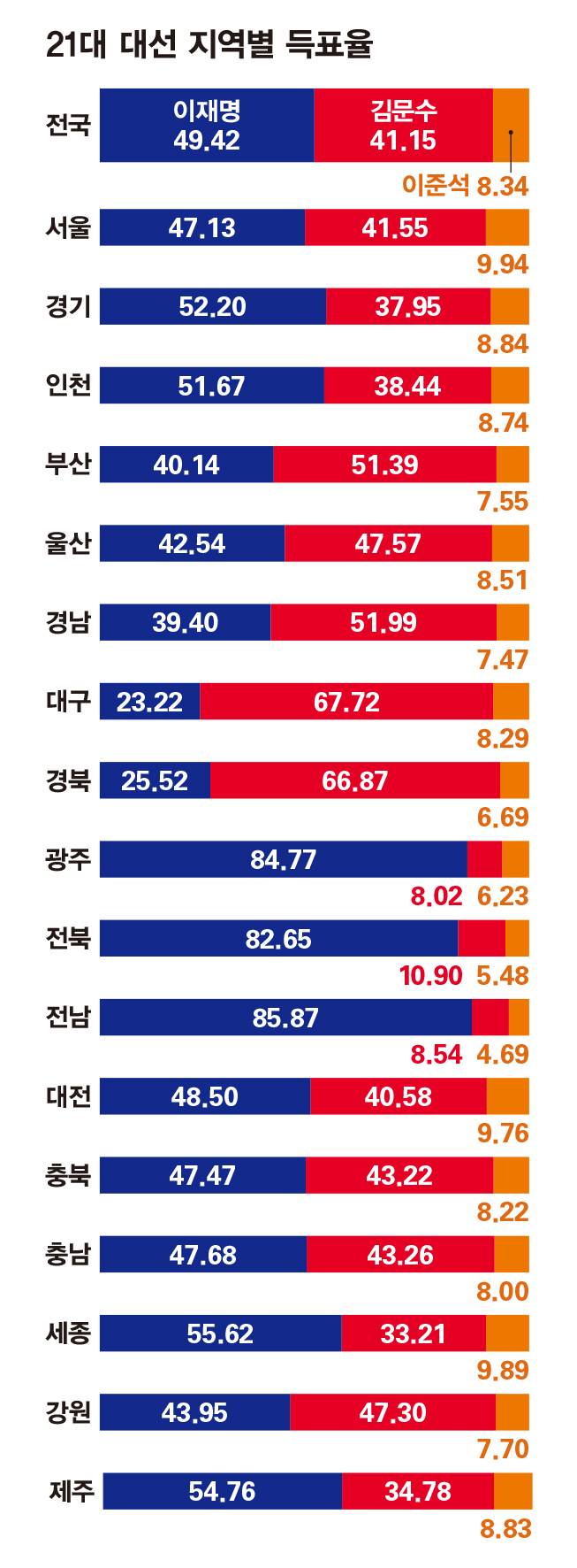 양 진영이 강하게 결집하면서 초박빙 승부였던 20대 대선과 비교했을 때 이 대통령은 이번 대선에선 각 지역에서 전반적으로 1~3%p 더 높은 득표율을 기록했다. 모두 80%를 넘긴 호남 지역에선 1%p 내로 미세하게 감소했으나 전체 득표율(20대 대선 47.93%)로 비교해도 1.49%p 상승했다. 이 대통령이 집토끼는 철저히 지켜냈고, 거기에 중도층의 일부를 흡수하면서 승기를 잡았다는 평가가 설득력을 얻는다.