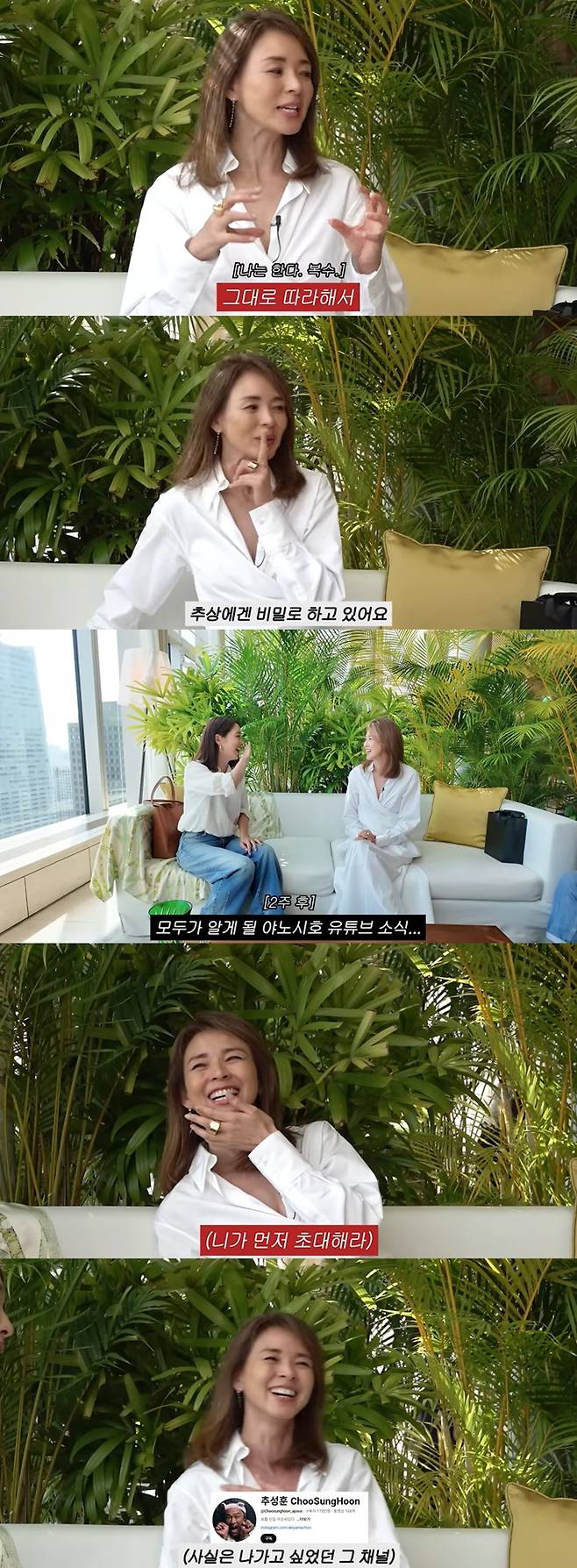 "서로 복수전 하는 거냐. 유튜브 조언은 추성훈에게 들었나"라는 이민정의 질문에 야노시호는 "추성훈에겐 비밀이다. 아직 모른다. 이 영상 언제 나오냐. 유튜브 하면 어떨까 이렇게만 이야기했다. 비밀이다"라며 자신도 추성훈에게 숨기고 있음을 밝혀 웃음을 자아낸다.