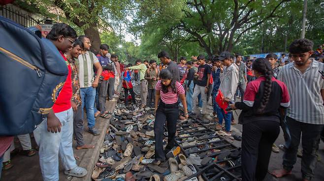 ▲ 인도 벵갈루루의 M. 치나스와미 스타디움 밖 거리에서 로열 챌린저스 벵갈루루(RCB) 팬들이 버려진 신발과 슬리퍼 더미에서 신발을 찾고 있다.
