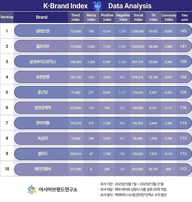이번 K-브랜드지수 제약·바이오 상장사 부문은 국내 제약·바이오 섹터 시총 상위 20개 기업을 대상으로, 2025년 5월 1일부터 5월 31일까지의 온라인 빅데이터 888만 2273건을 분석했다.