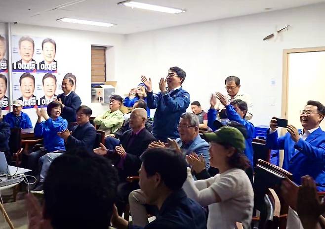 | ▲ 지난 3일 대통령선거 종료 후 방송3사의 출구조사 결과, 이재명 후보가 앞서는 것으로 나오자 민주당 서산태안 정당 사무소에 모여있던 지지자와 당원들이 환호하고 있다. |