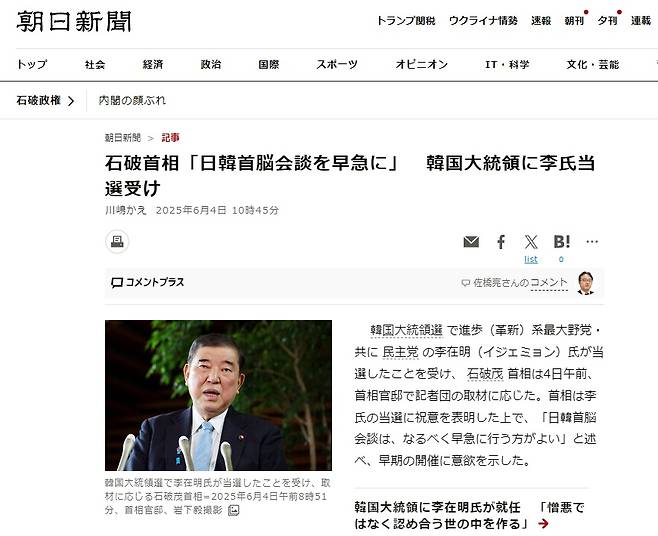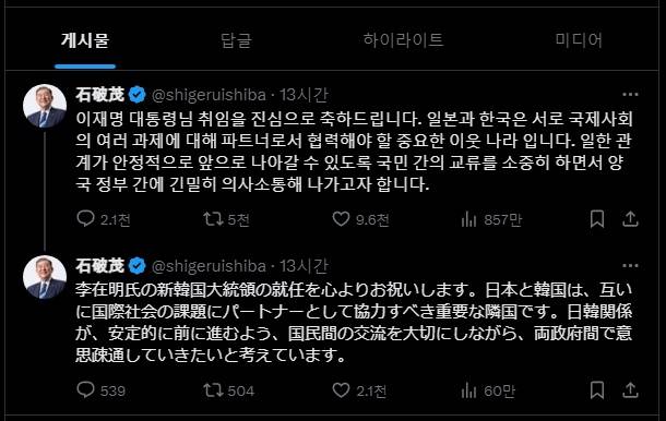 4일 오전, 이시바 시게루 일본 총리는 소셜미디어 엑스(X, 구 트위터)에 한글로 이 같은 메시지를 남겼다. 한국의 제21대 대통령으로 취임한 이재명 대통령에게 보낸 축하 메시지였다. 이시바 총리는 일본어로 된 동일한 메시지도 함께 게시했다.