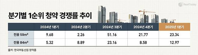 오늘(5일) 부동산 전문 리서치업체 리얼투데이가 한국부동산원 청약홈 자료를 분석한 결과, 지난 1분기 전용 59㎡ 타입 아파트의 1순위 청약 경쟁률은 평균 23.34대 1로 나타났습니다.