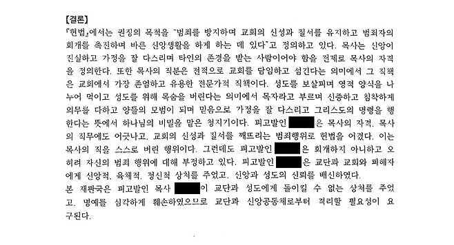 재판국은 판결문에서 A 씨가 "회개하지 않고 범죄를 부정하며 피해자들에게 육체적·정신적 상처를 줬고, 교단과 성도의 신뢰를 배신했다"며 "더 이상의 피해 방지를 위해 교단과 신앙공동체로부터 격리해야 한다"고 명시했다.